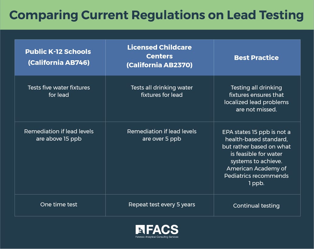 More recently, California’s AB2370 required licensed childcare centers built before 2010 to test their drinking water for lead by the end of 2022. Although both programs arose from California state regulations, there were key differences between the childcare and K-12 school lead testing programs. For instance, the childcare testing program’s lead action level was set at 5 ppb, which is a third of the previous school testing program’s action level of 15 ppb. Not only was the school program’s lead action level far less protective from a public health perspective, but its requirement to test only five fixtures in the whole school also fell short. In contrast, the childcare program required testing of all drinking water fixtures. With one fixture unable to represent all others, this requirement is considered a best practice by the EPA. Finally, the school program was a one-time test, whereas the testing in childcare centers is required to be done every 5 years; a sensible measure because lead levels may change over time and, therefore, should be monitored periodically.