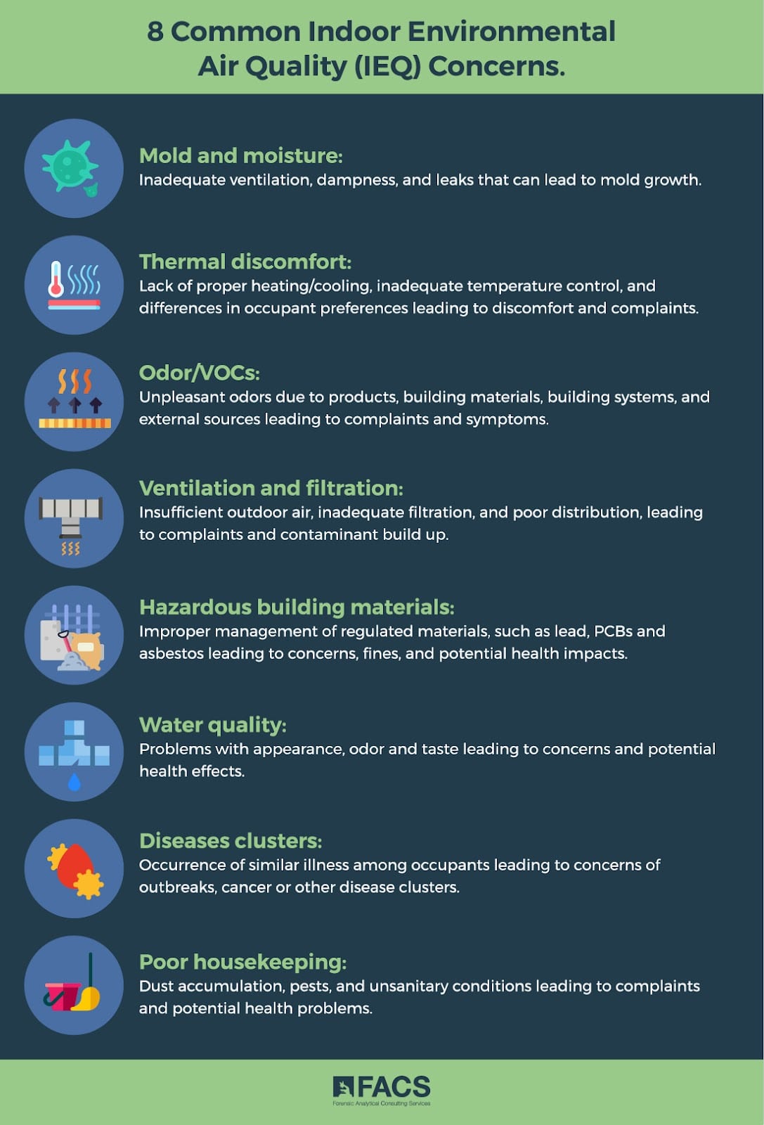 As public awareness of the impact of the environment on human health heightens, so do the demands of employees to work in a safe, healthy environment free of hazards. Concerns over the health of a building, commonly referred to as Indoor Environmental or Air Quality (IEQ or IAQ), can affect the comfort, health, productivity, and overall satisfaction of building occupants. Common IEQ concerns include but are not limited to: