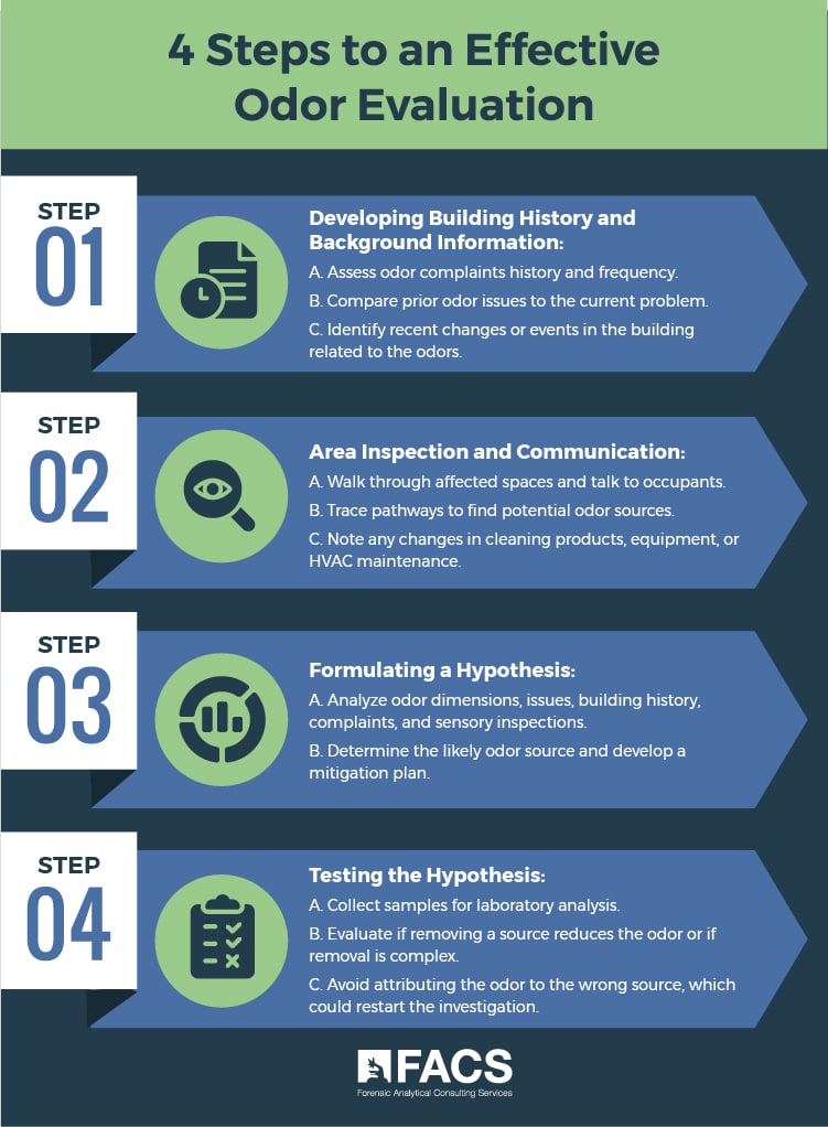 Once you’ve categorized the dimensions of the odor and the issues it is apparently causing, you’re ready to begin a step-by-step investigation. Below is the standard sequence FACS experts follow when performing an odor evaluation.