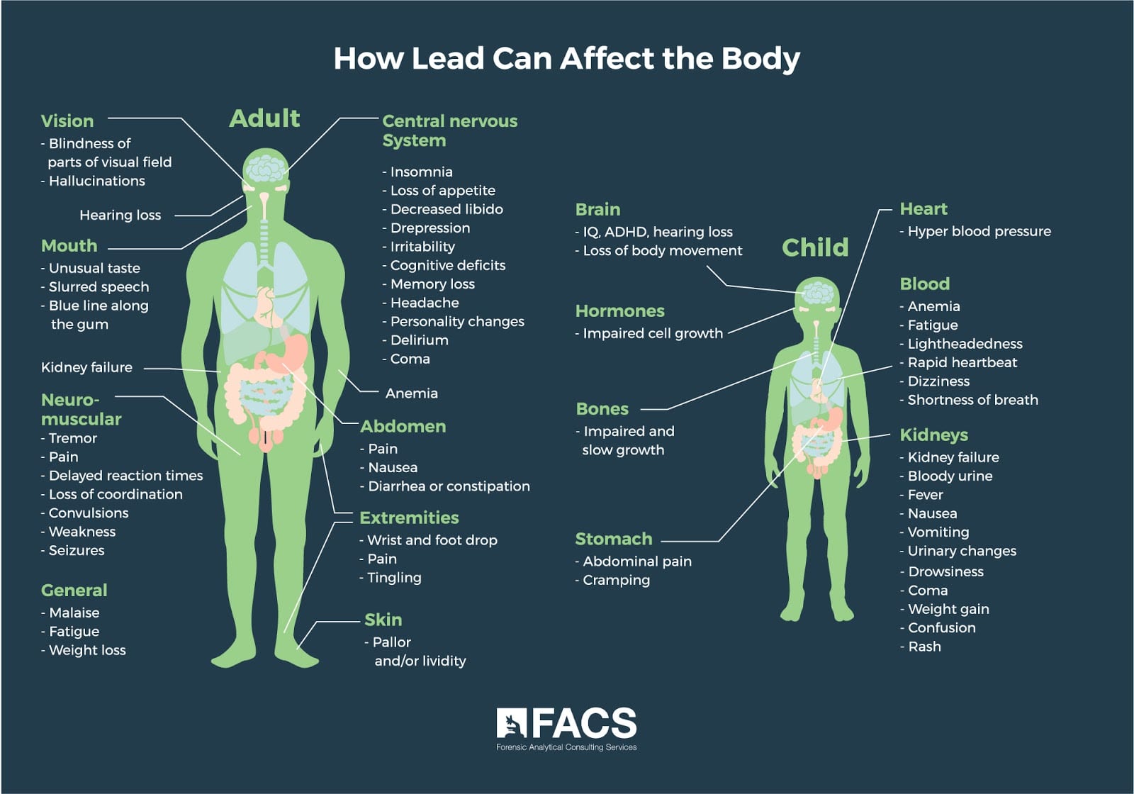 Adults exposed to lead can suffer cardiovascular problems, kidney malfunction, and reproductive problems. Lead can cross the placental barrier and lead to premature birth and reduced growth of the fetus. And lead’s effect on children can be devastating: learning problems, behavior problems, hearing problems, lower IQ, and slowed growth.