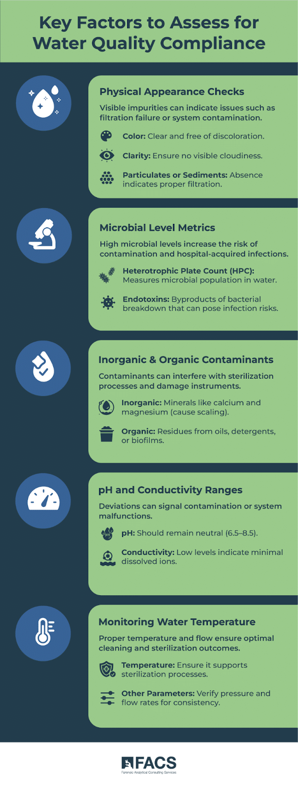 - Microbial levels, such as heterotrophic plate count (HPC) and endotoxin levels