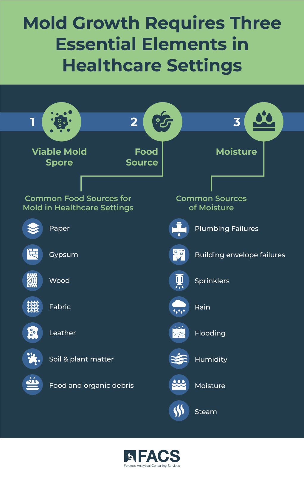 Mold growth requires three essential elements: a viable mold spore, a food source, and moisture. Common food sources in healthcare settings include paper, gypsum, wood, fabric, leather, soil/plant matter, adhesives, food, and organic debris. Moisture sources can arise from plumbing failures, building envelope failures, sprinklers, runoff, rain, flooding, humidity, moisture, and steam.