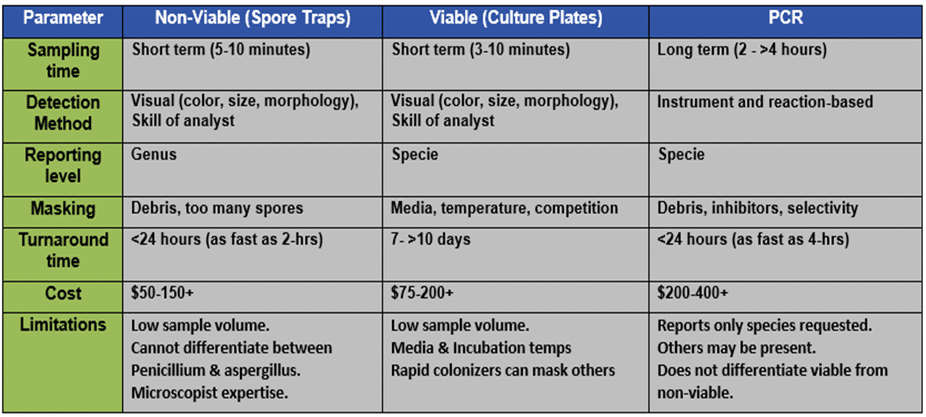 Species-level sampling is crucial in the healthcare environment, to demonstrate the presence or absence of infectious mold species. This can allow for the matching of environmental samples to patient biological samples during suspected healthcare acquired infections. Common collection methods include surface sampling, bulk sampling, and air sampling. The most common air sampling technique is the non-viable spore trap sample. However, when working in the healthcare environment, this common sampling and analytical strategy may not be sufficient in evaluating the environment. Therefore, to allow for species-level identification, sampling and analytical methods must include either viable (e.g., culture plates) or Polymerase Chain Reaction (PCR; DNA analysis). The table below compares the various sampling and analysis techniques.
