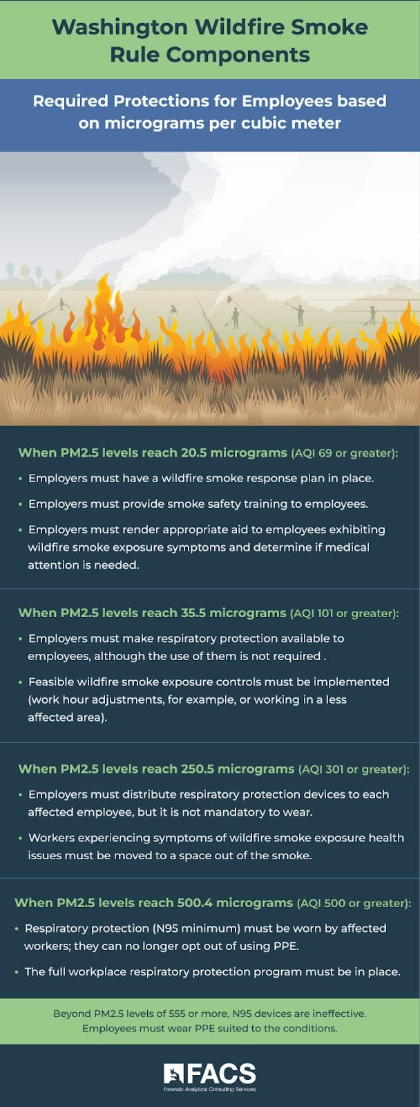 The new Washington Wildfire Smoke Rule will be in effect year-round and will activate whenever workers are exposed to the hazards of wildfire smoke. The rule will provide layers of protection that increase in protective cautions in direct proportion to upticks in PM2.5 levels, and employers may use the Air Quality Index (AQI) to help determine the PM2.5 concentration levels. You can find instructions for how to access and interpret the AQI scores on the federal AirNow website.