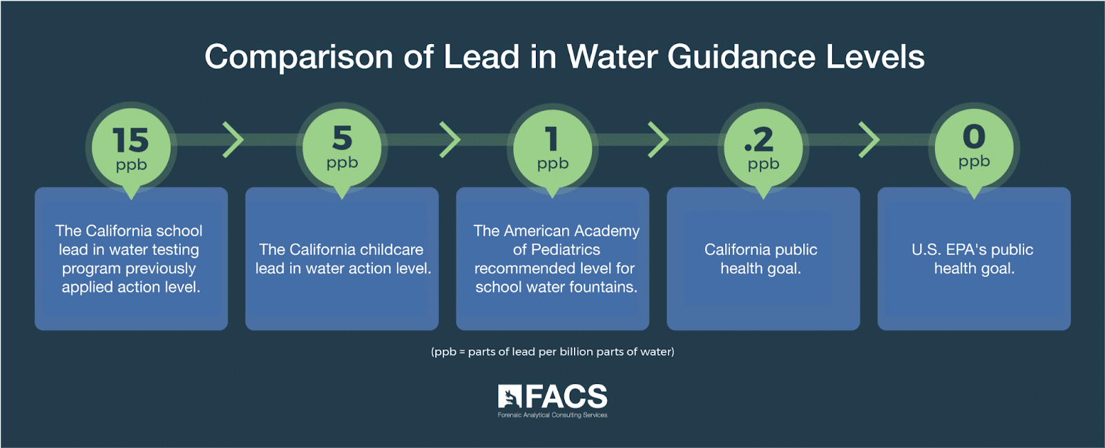 What Level is Safe? The recent California school lead in water testing program applied an action level of 15 ppb, while these new childcare requirements use an action level of 5 ppb. There are also additional even lower guidance levels from respected authorities, including: a California public health goal of 0.2 ppb, an American Academy of Pediatrics recommendation of 1 ppb (for school water fountains), and a U.S. EPA goal of 0 ppb. Although you may fall under the stated action level of this new requirement, your stakeholder community may have an expectation that levels be reduced even further. FACS has seen this dynamic occur in school board meetings and has advised clients on setting policies and managing risk communication.