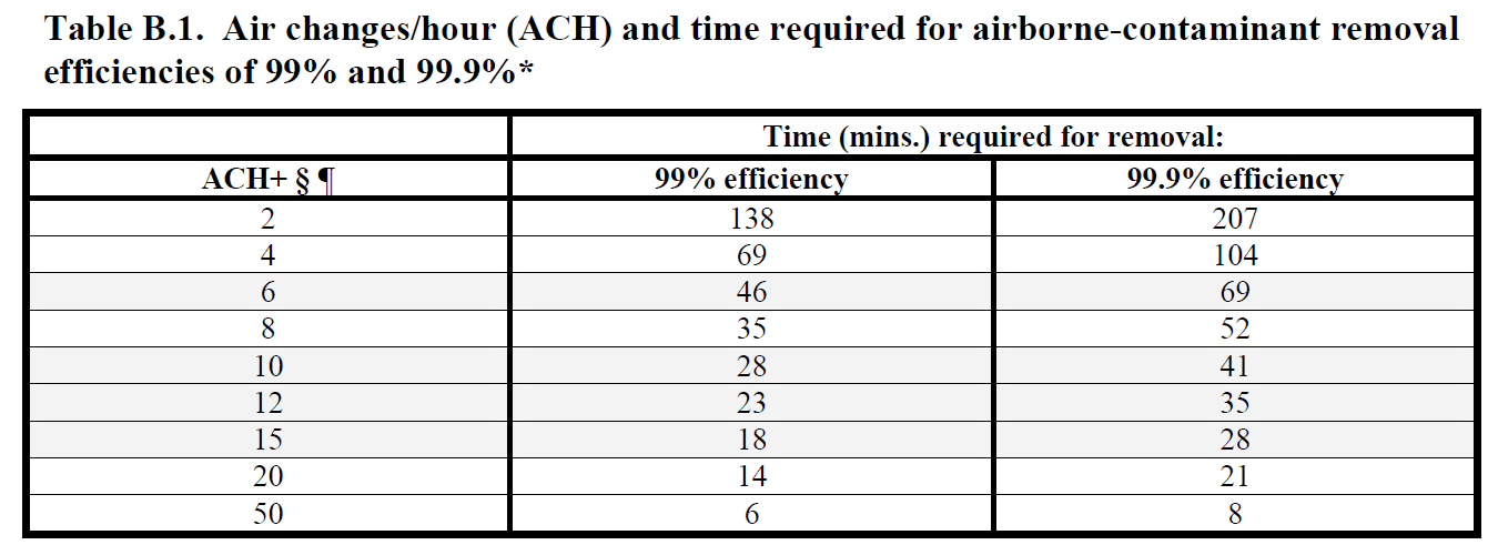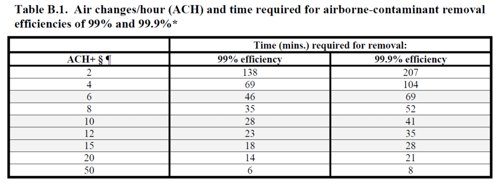 The CDC Guidelines has published a table the shows the impact of air exchange rates on the removal of airborne contaminants from a controlled space.  It looks at the time it takes to remove 99% and 99.9% of airborne contaminants based on the number of air changes per hour (ACH).  Air changes per hour is a description of how many times the full volume of room air is exchanged.  Increasing the ACH reduces the time needed.