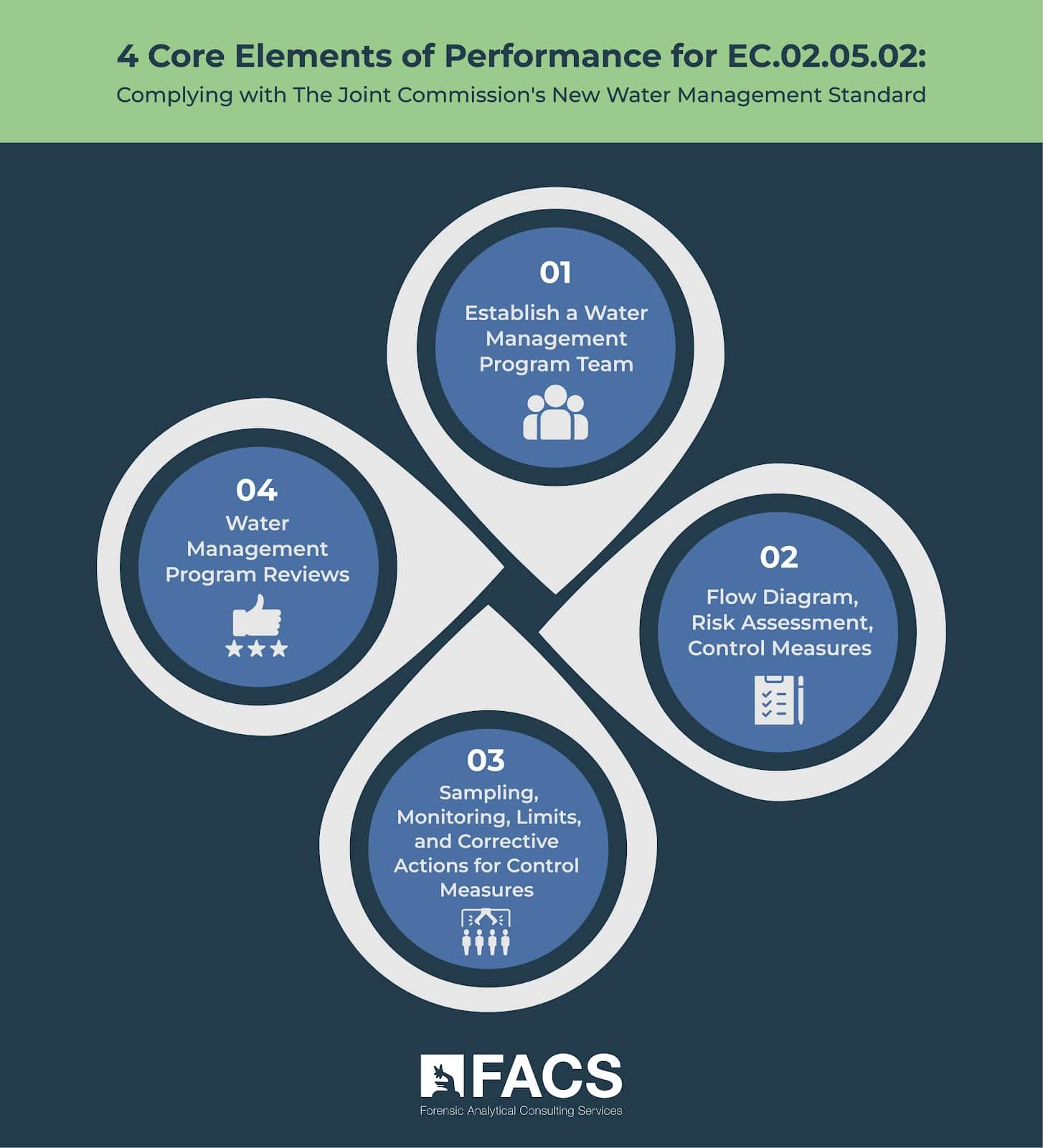 The new water management standard was created to guide hospitals on how to minimize health risks associated with “pathogenic biological agents”. It requires hospitals and nursing care centers to have a written water management program (WMP) that addresses “Legionella and other waterborne pathogens.” Below are the four core Elements of Performance (EP) for EC.02.05.02 that you need to know and include to ensure your current program complies with the new standard.