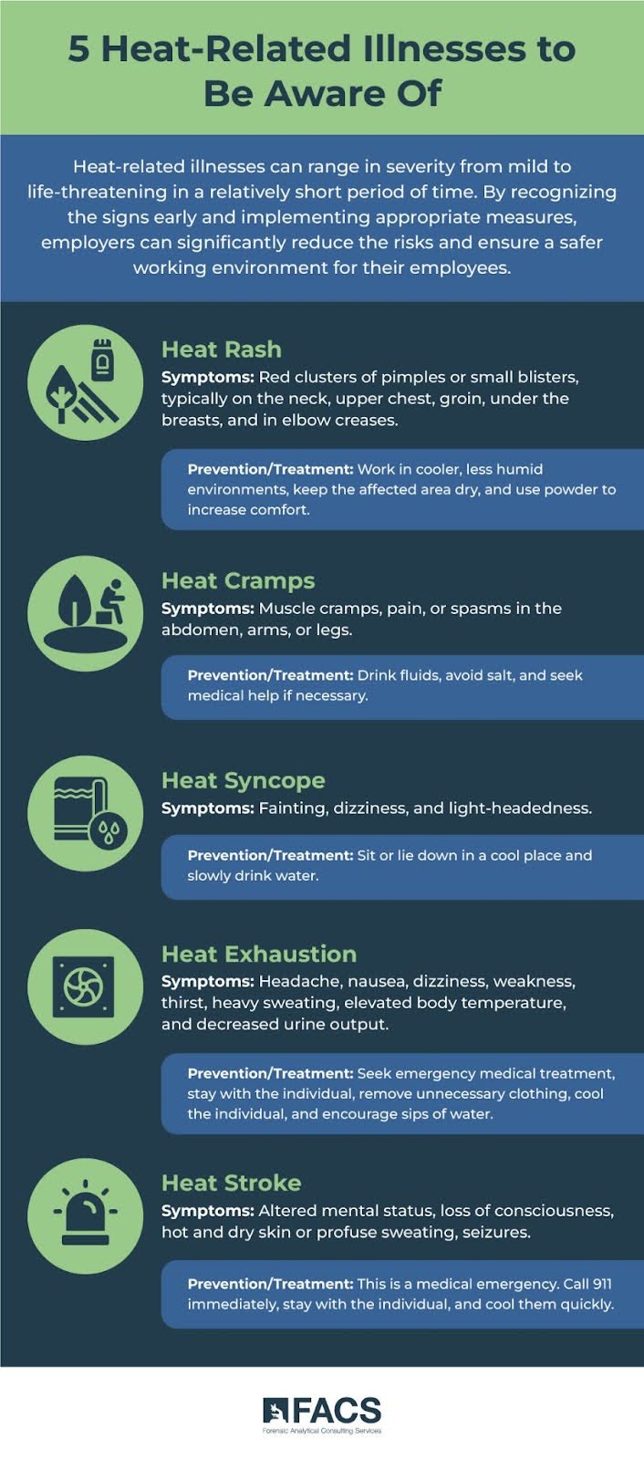Heat-related illnesses can vary in severity from mildly bothersome to life-threatening, in a relatively short period of time. Understanding the differences is crucial for effective prevention and treatment. Each type of heat-related illness presents distinct symptoms and requires specific interventions. By recognizing the signs early and implementing appropriate measures, employers can significantly reduce the risks and ensure a safer working environment for their employees. In this section, we will explore the various types of heat-related illnesses, their symptoms, and commonly recommended treatments.