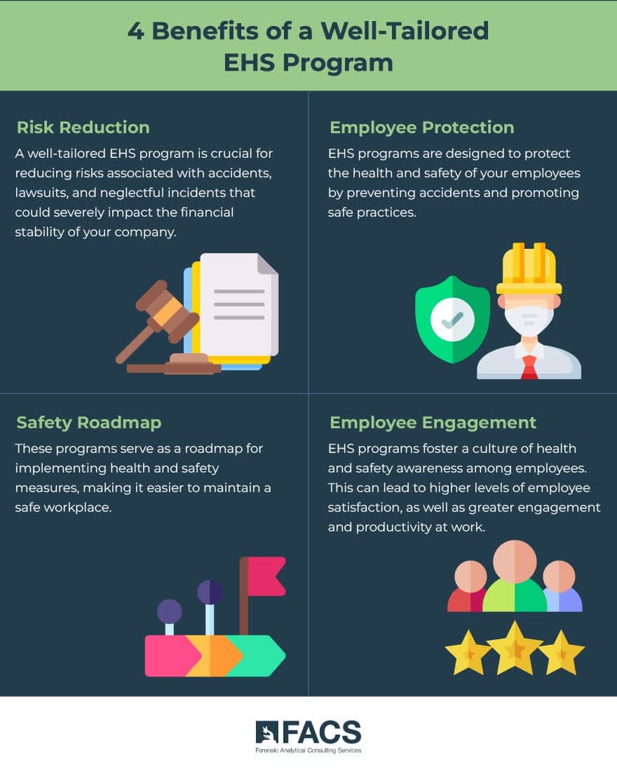 The primary business reason for having tailored EHS programs is to reduce risk. Think about it: one accident deemed neglectful on your part, one lawsuit, and one incident can severely impact your finances. You can’t afford to take your EHS programs lightly.