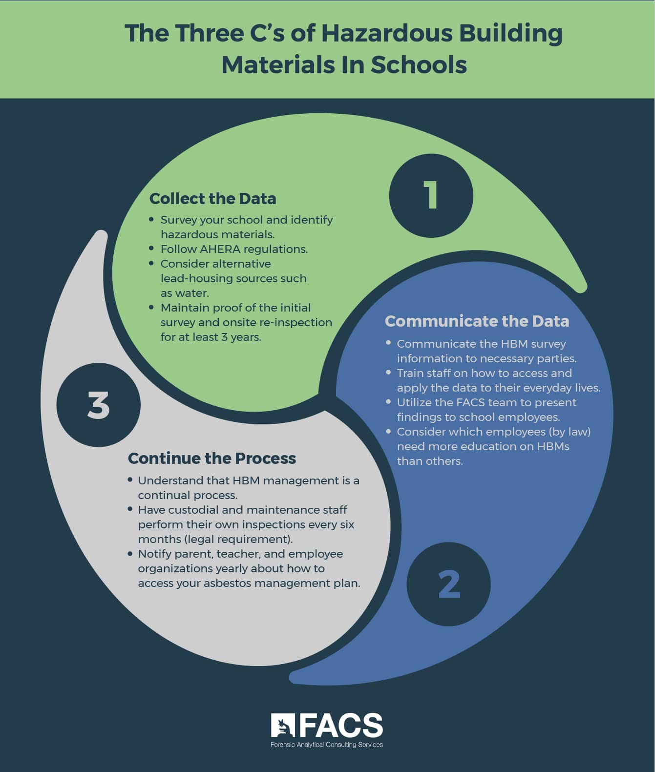 The proper management of HBMs is a process, and it does require the expenditure of both time and money. Many times, school administrators have a misunderstanding of the issue. They either don’t believe HBMs are present in the school (with no data to back it up), don’t understand that the materials can pose a serious threat, or are so understaffed they don’t have the awareness to worry about it. The Three C’s of HBM management in schools (listed below) will show you how to display exemplary leadership in this very serious matter — even if you are in a smaller school district and resources are limited.