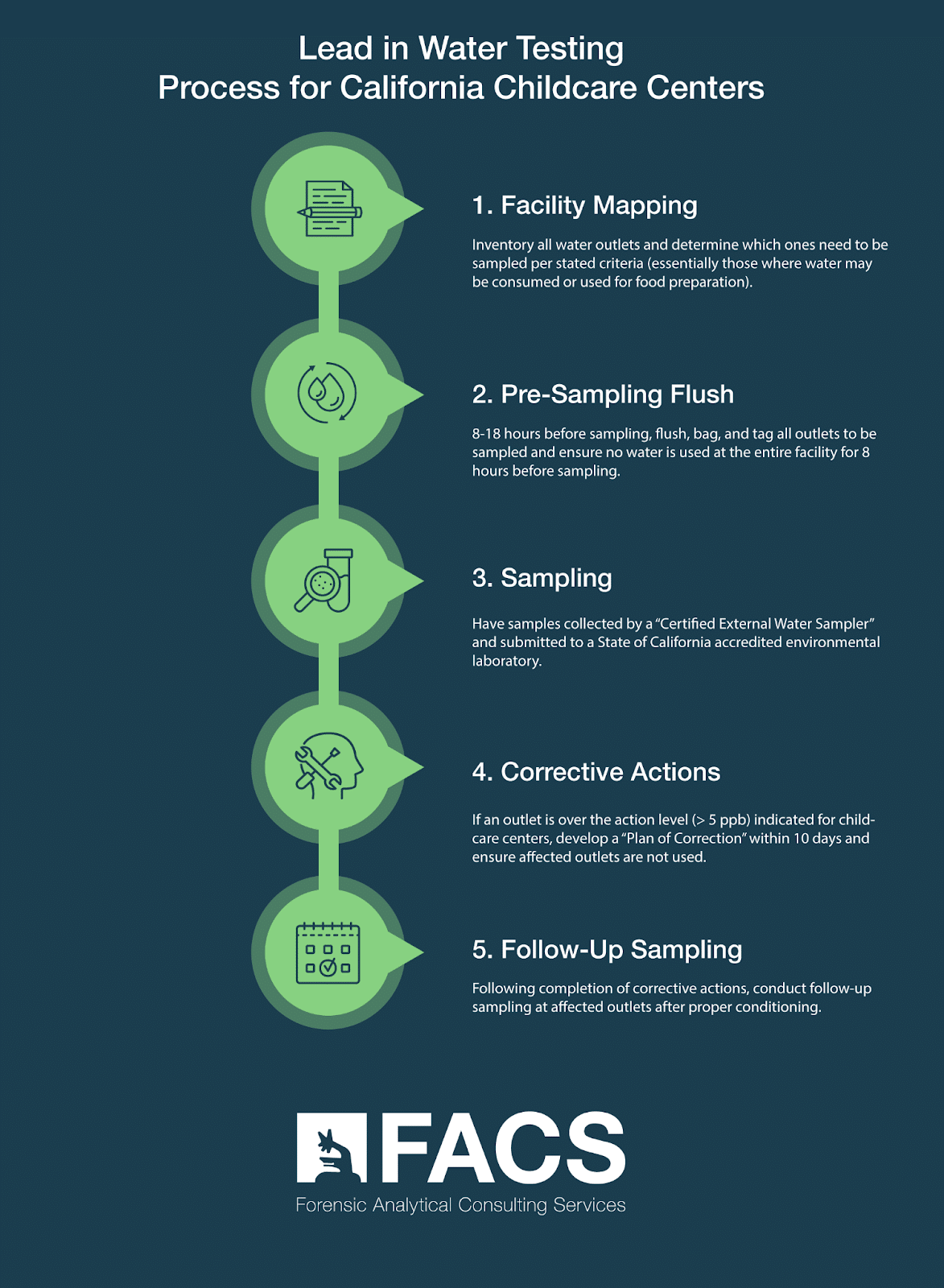 Lead in drinking water presents very real public health risks, especially for children. In children, lead exposure can cause damage to the brain and nervous system, slowed growth and development, learning and behavior problems, and hearing and speech problems. No safe level of lead exposure in children has been identified. The latest round in the battle to get the lead out has landed with the California Department of Social Services (DSS) Provider Information Notice (PIN) Summary 21-21-CCP. This notice and associated procedures require all licensed Child Care Centers (CCCs) in California that were constructed before January 1, 2010, to test drinking water for lead in compliance with Assembly Bill (AB) 2370, Chapter 676, Statutes of 2018. While there are plenty of detailed requirements in the PIN that should be thoroughly reviewed by impacted facilities, FACS has put together the following highlights.